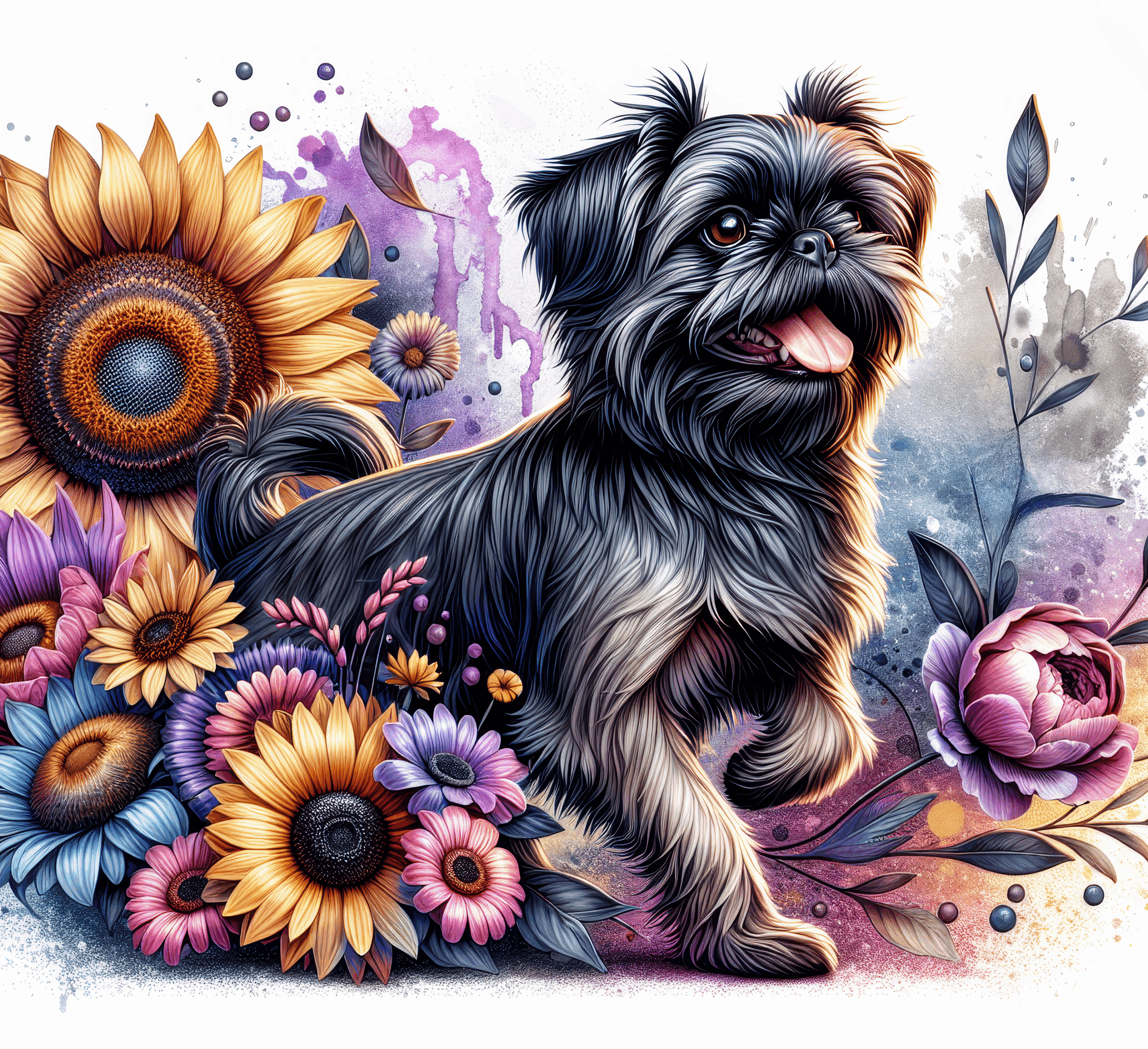 Every element in the layout is arranged with purpose. As the blossoms surround the Griffon’s face, they enhance rather than overwhelm it, maintaining a clean balance between personality and elegance. Ultimately, this design offers a daily reminder of the breed’s uniqueness.