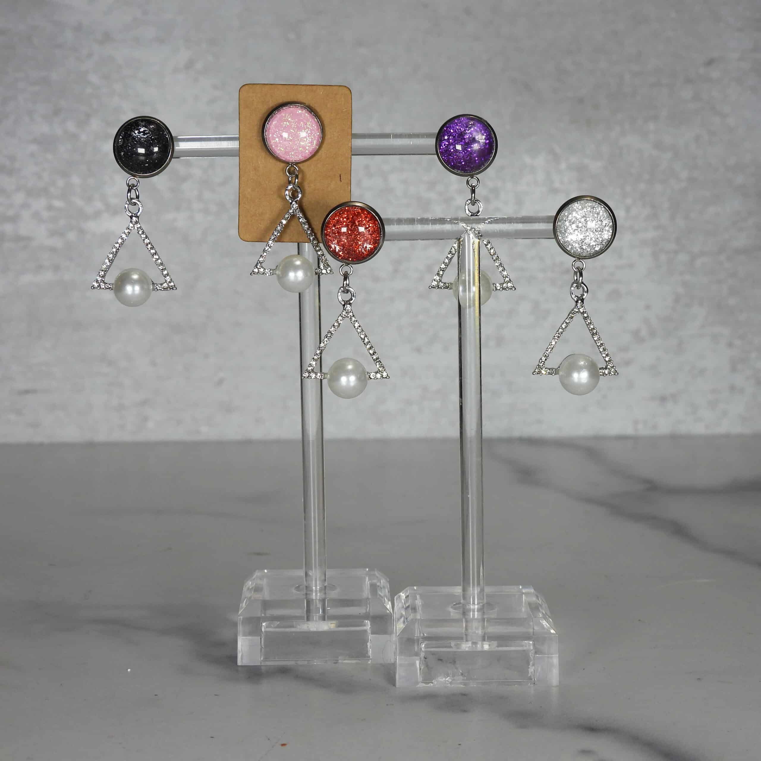 Crafted from lightweight and hypoallergenic materials, these earrings are suitable for sensitive ears and comfortable enough for all-day wear. The thoughtful design ensures that you can enjoy the sparkle and elegance without any irritation or discomfort. Perfect for parties, special events, or a polished everyday look, these Cabochon Glitter Earrings with Dangling Sparkly Triangle and Faux Pearl are a beautiful blend of modern style and timeless charm.