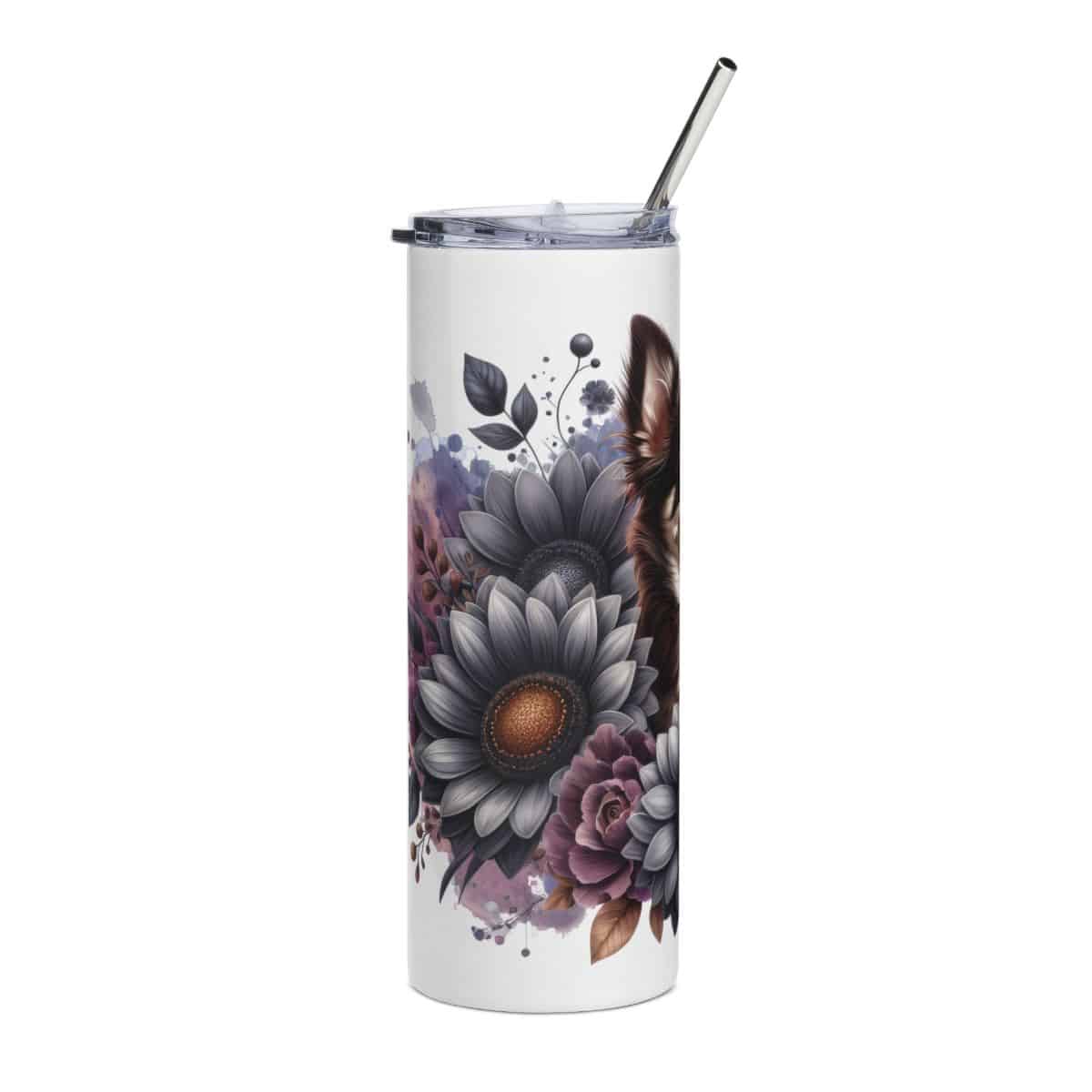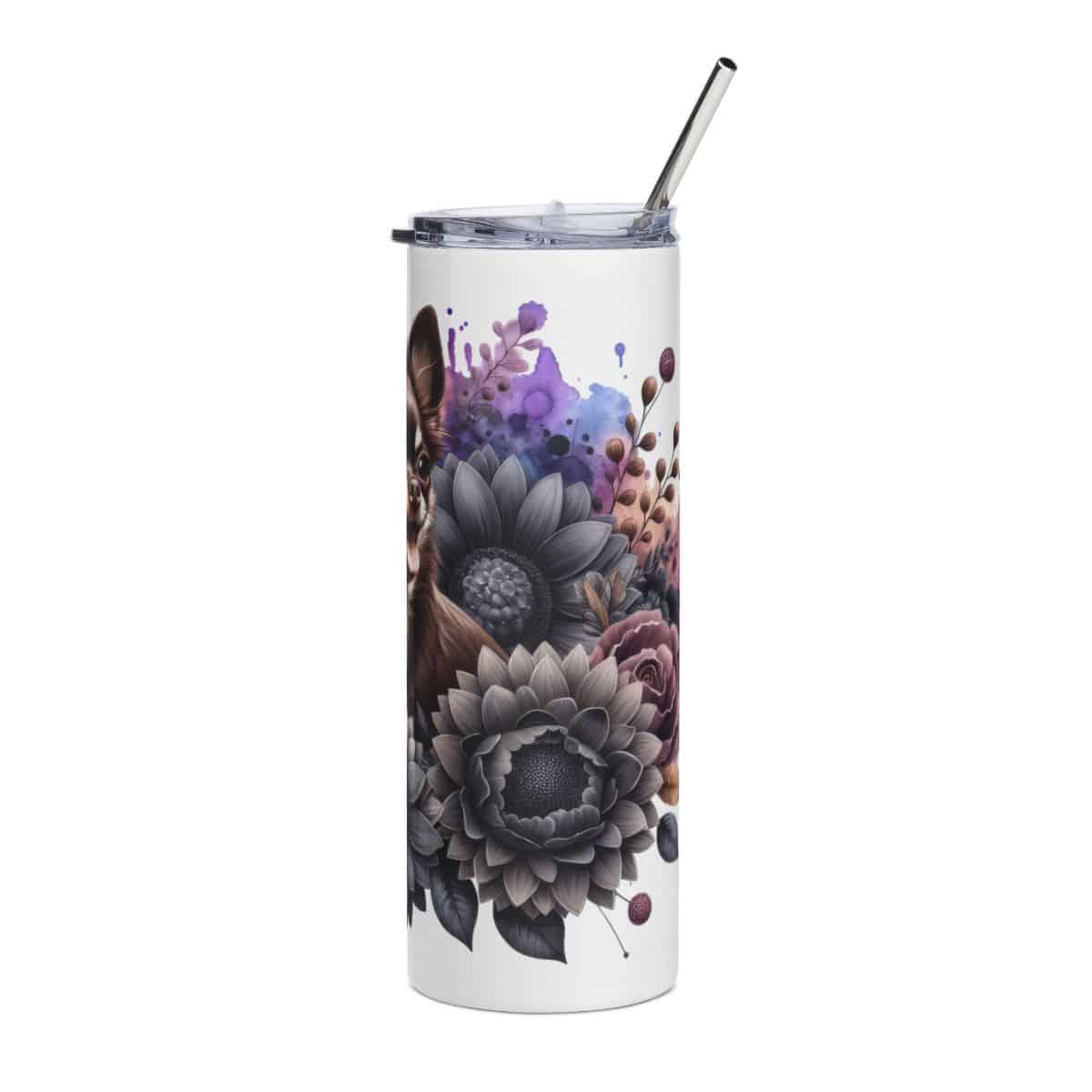 The Chocolate Chihuahua in Flowers 20oz Tumbler captures the charm of this tiny but expressive breed. With its oversized ears and wide-eyed gaze, the dog sits front and centre, radiating curiosity and spirit. Around it, soft flowers in warm tones create a gentle contrast that highlights the Chihuahua’s chocolate brown coat.