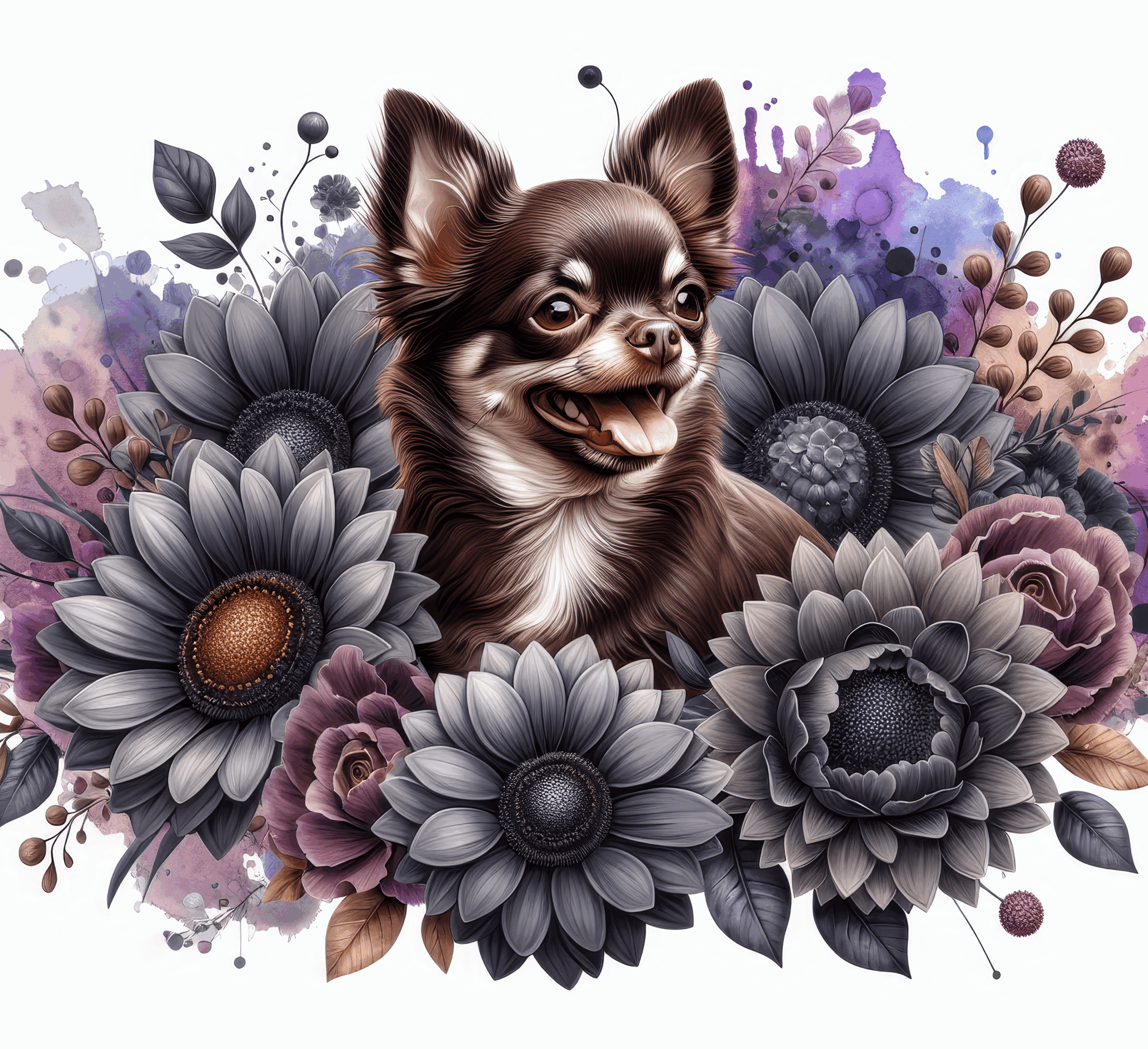 Although the breed is small in stature, its personality is often larger than life. This design captures that balance between delicacy and boldness in a playful and inviting way. The combination of blossoms and pet features evokes warmth, sweetness, and individuality.