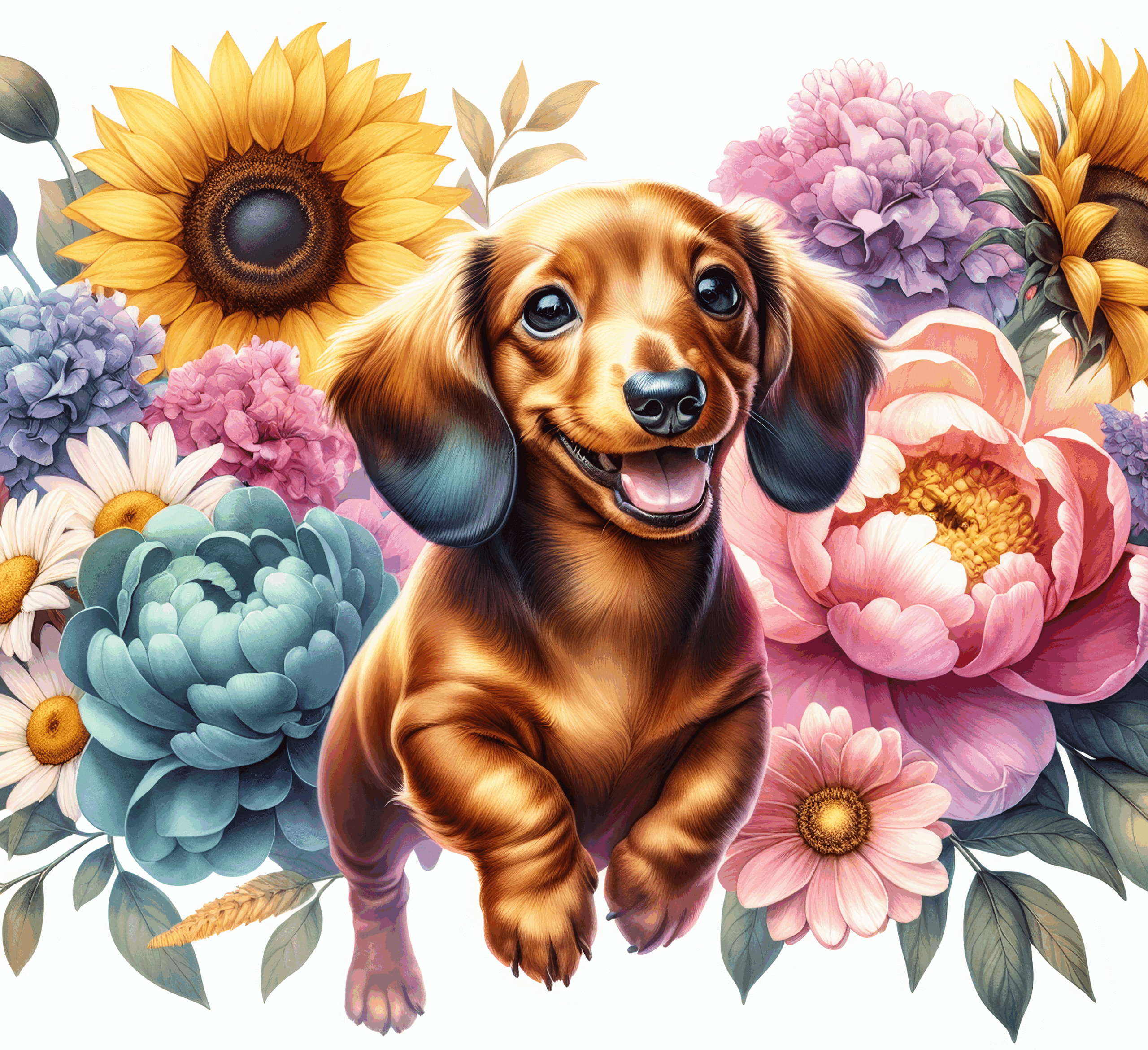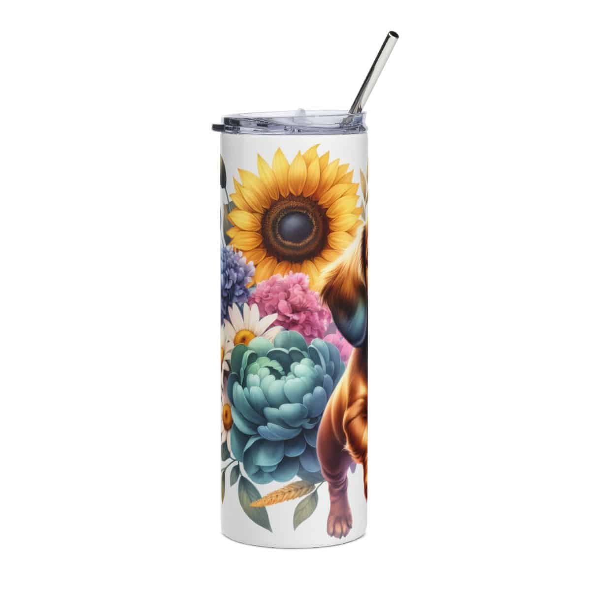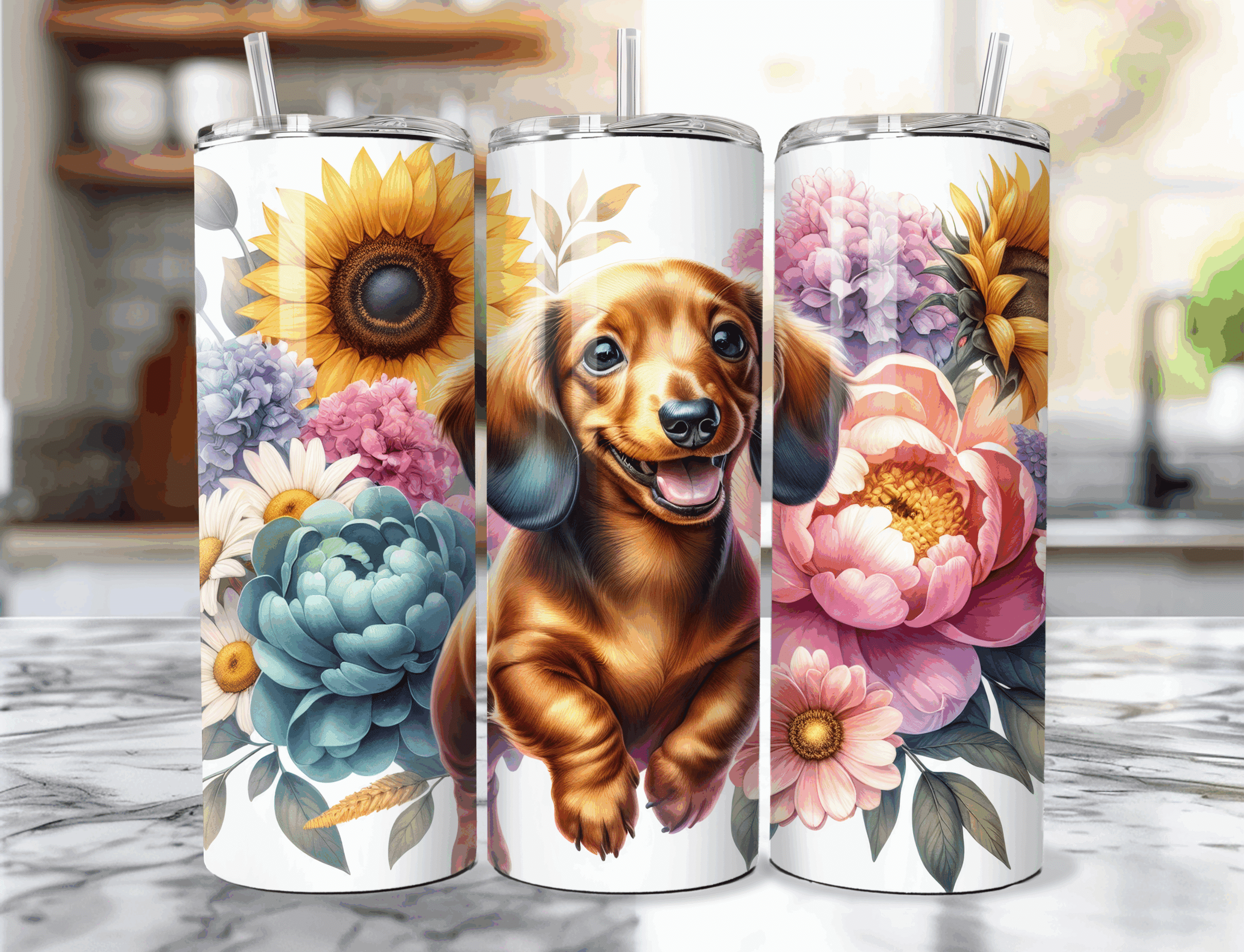 This tumbler features a full-wrap sublimation design showcasing an adorable Dachshund framed by bright, colourful florals. The breed’s long body, expressive face, and alert posture are captured with sharp detail, while the surrounding flowers soften the design and add playful warmth.