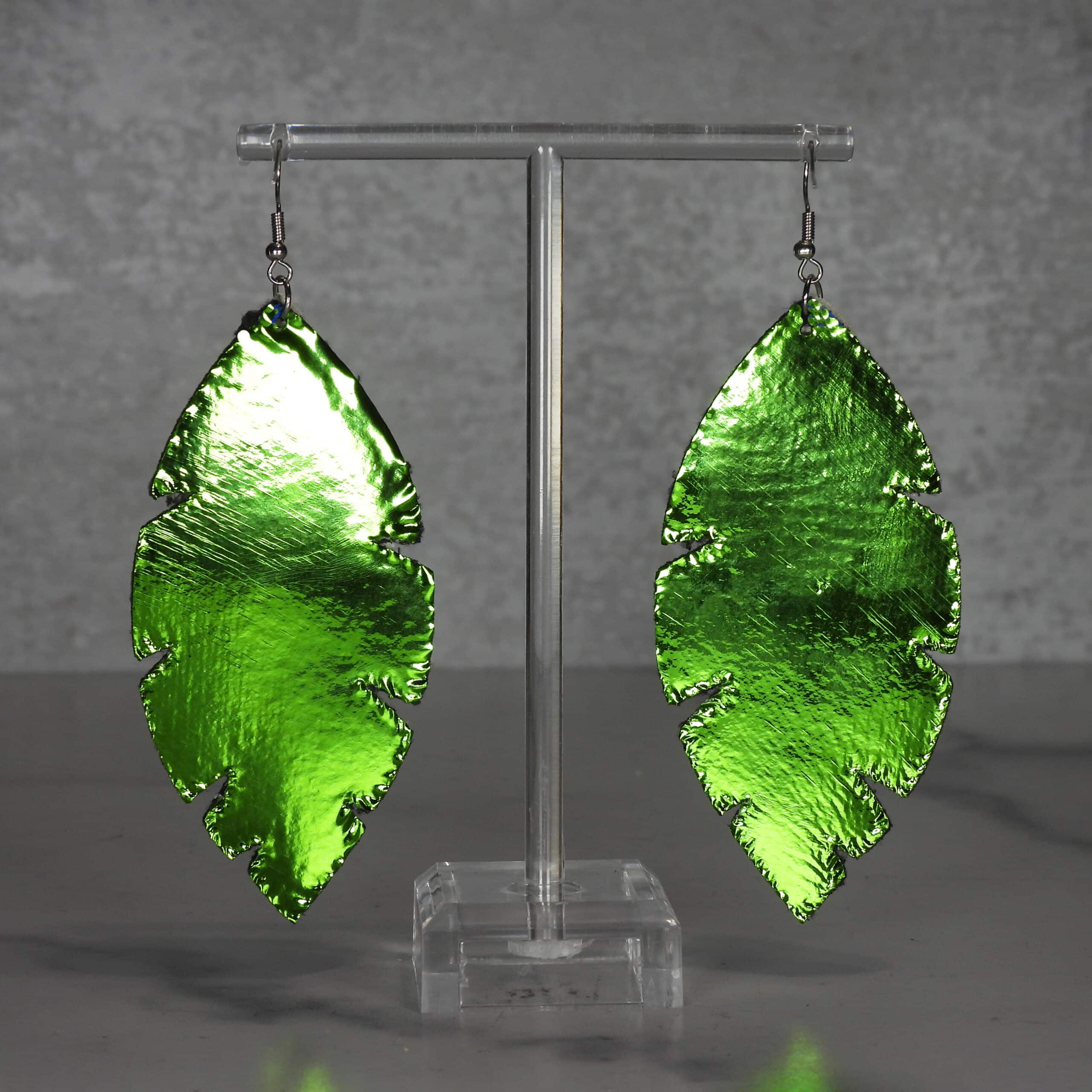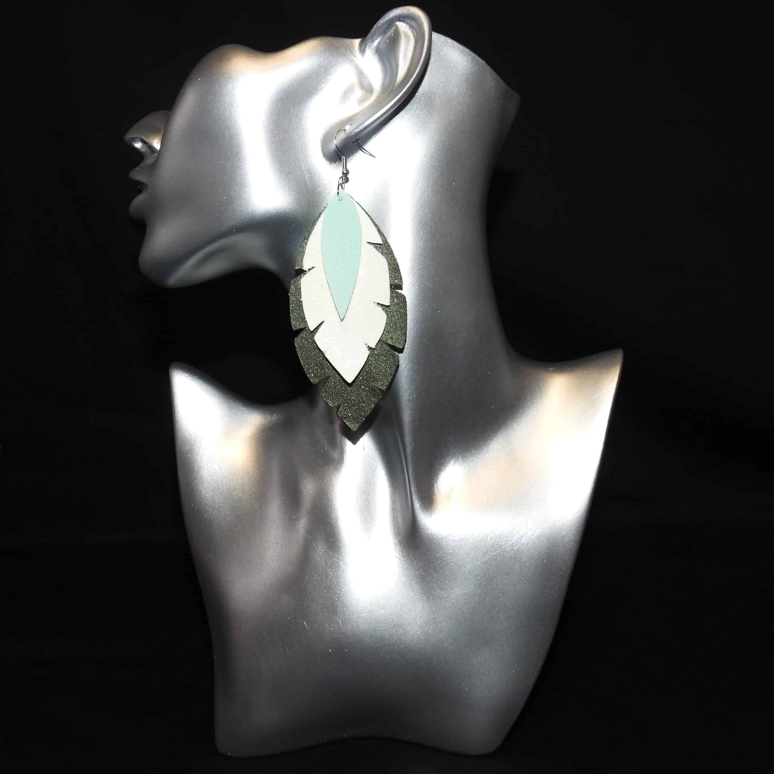 Designed to stand out, these earrings feature layers of faux leather in dark green and white glitter. Additionally, they are accented by a center layer of pastel green. Furthermore, this unique color combination creates a striking contrast, making them perfect for adding a pop of color and sparkle to any outfit.