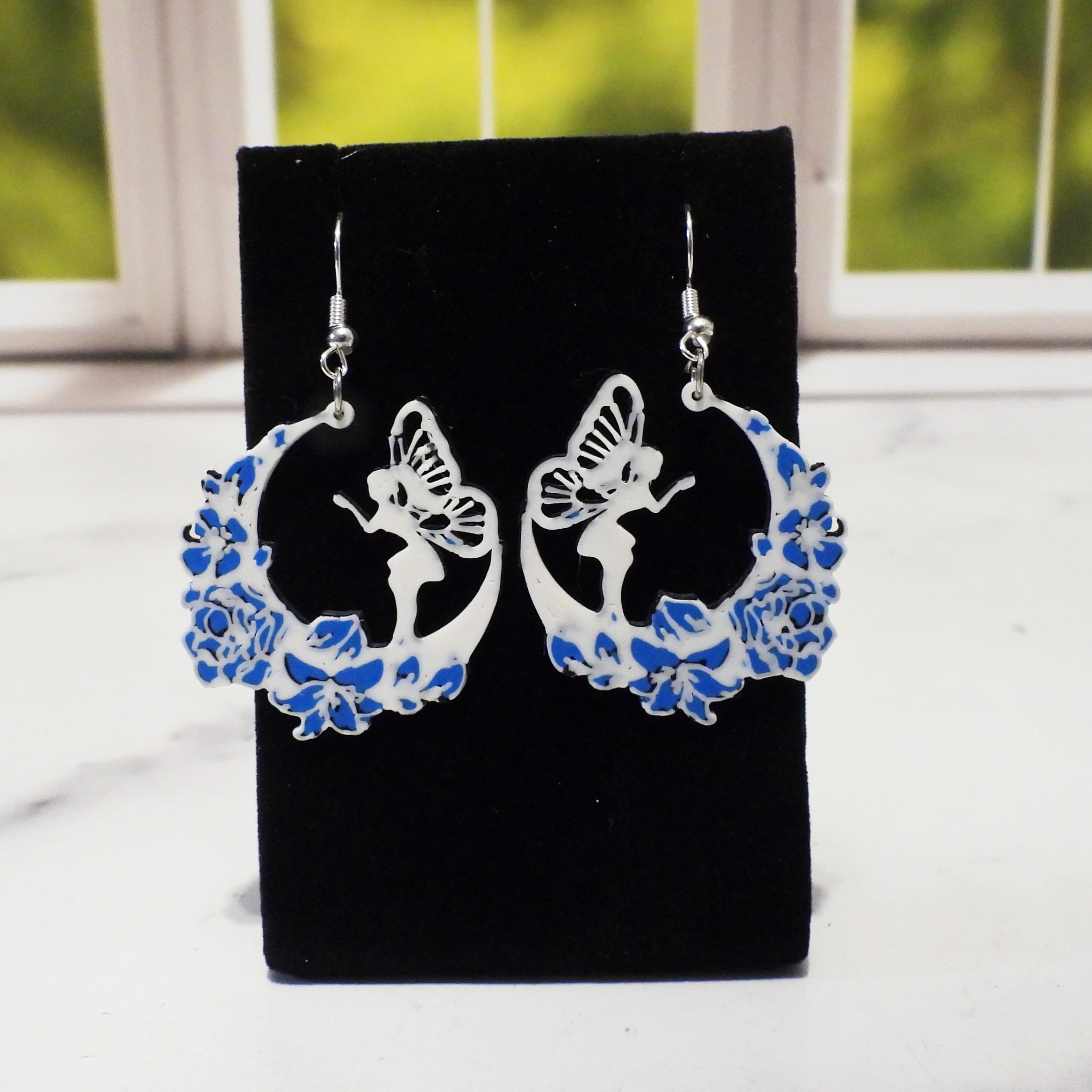 The striking blue floral accents create a beautiful contrast against the white fairy and moon silhouette. These pops of colour enhance the overall design, giving the earrings a lively and refreshing appearance. The blue flowers evoke feelings of calm and serenity while maintaining a vibrant and eye-catching quality.