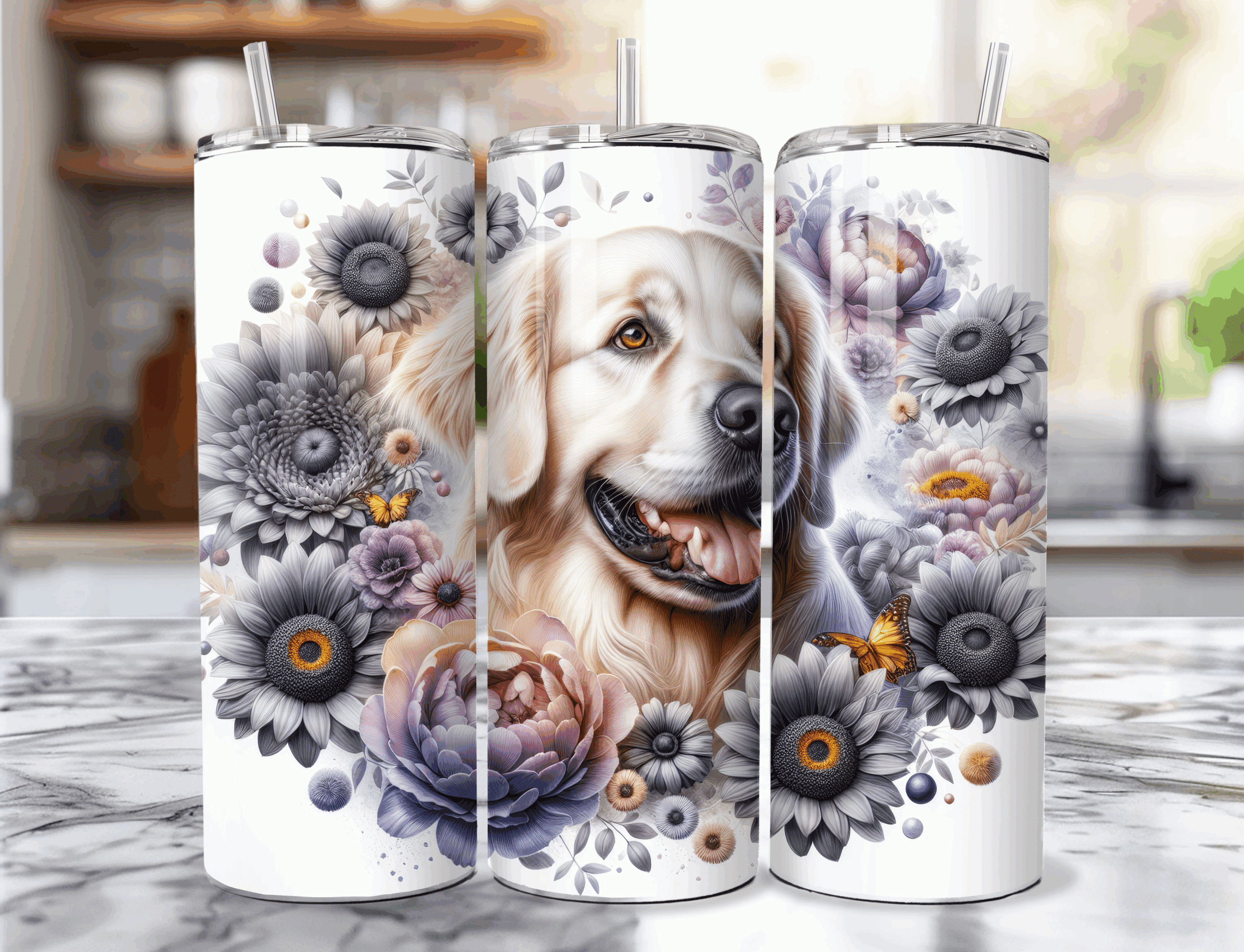 The Golden Retriever in Flowers 20oz Tumbler brings together cheerful artwork, durable construction, and real-world function. It’s more than a tumbler—it’s a daily companion filled with warmth and heart.