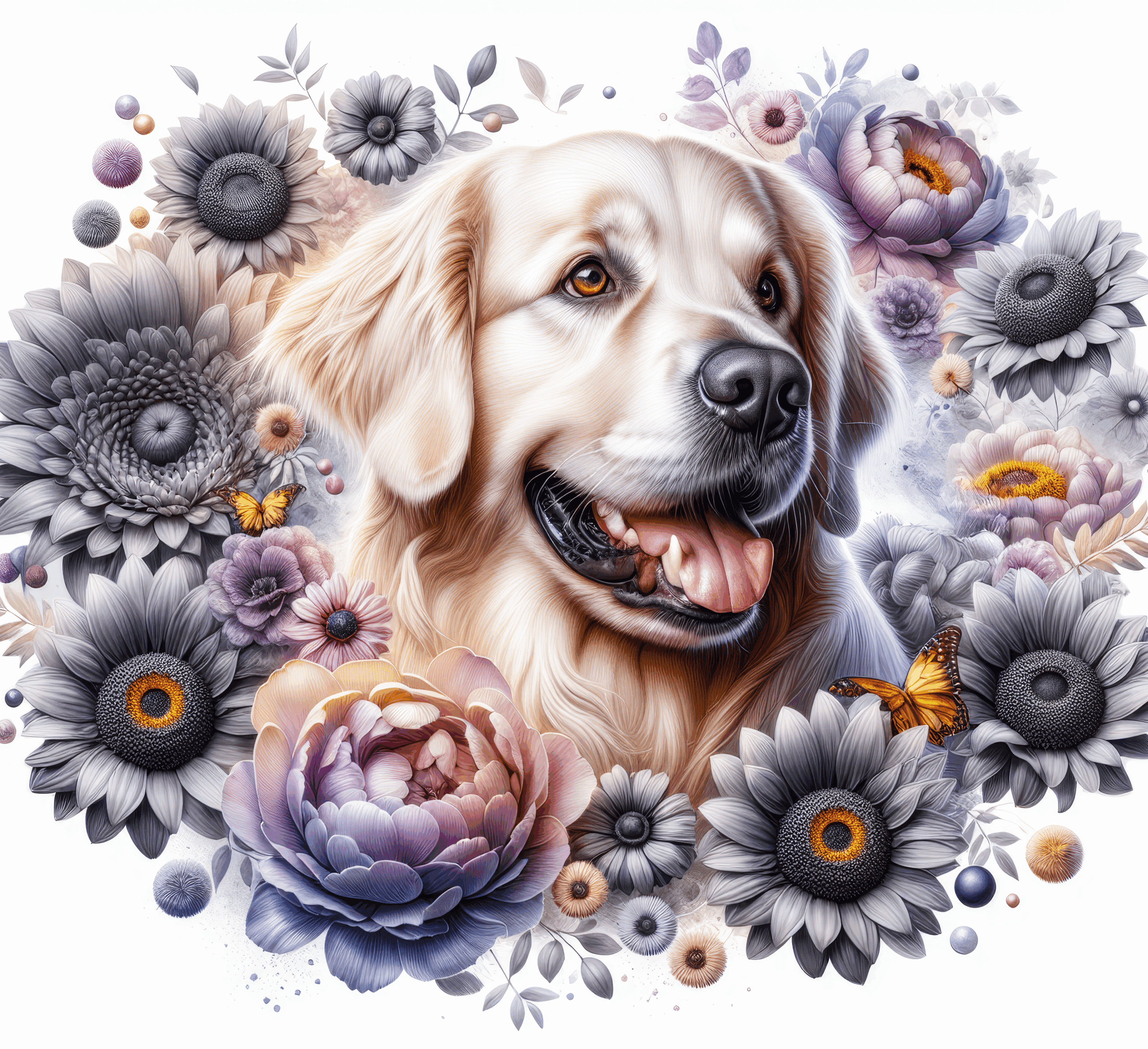 Soft florals wrap gently around the retriever’s broad chest and fluffy tail. These delicate blossoms add lightness and contrast without overwhelming the figure. Together, the dog and blooms form a scene that radiates peace, approachability, and cheerful devotion. The design reflects the breed’s affectionate presence, capturing the warmth and gentle spirit that make Golden Retrievers so beloved.
