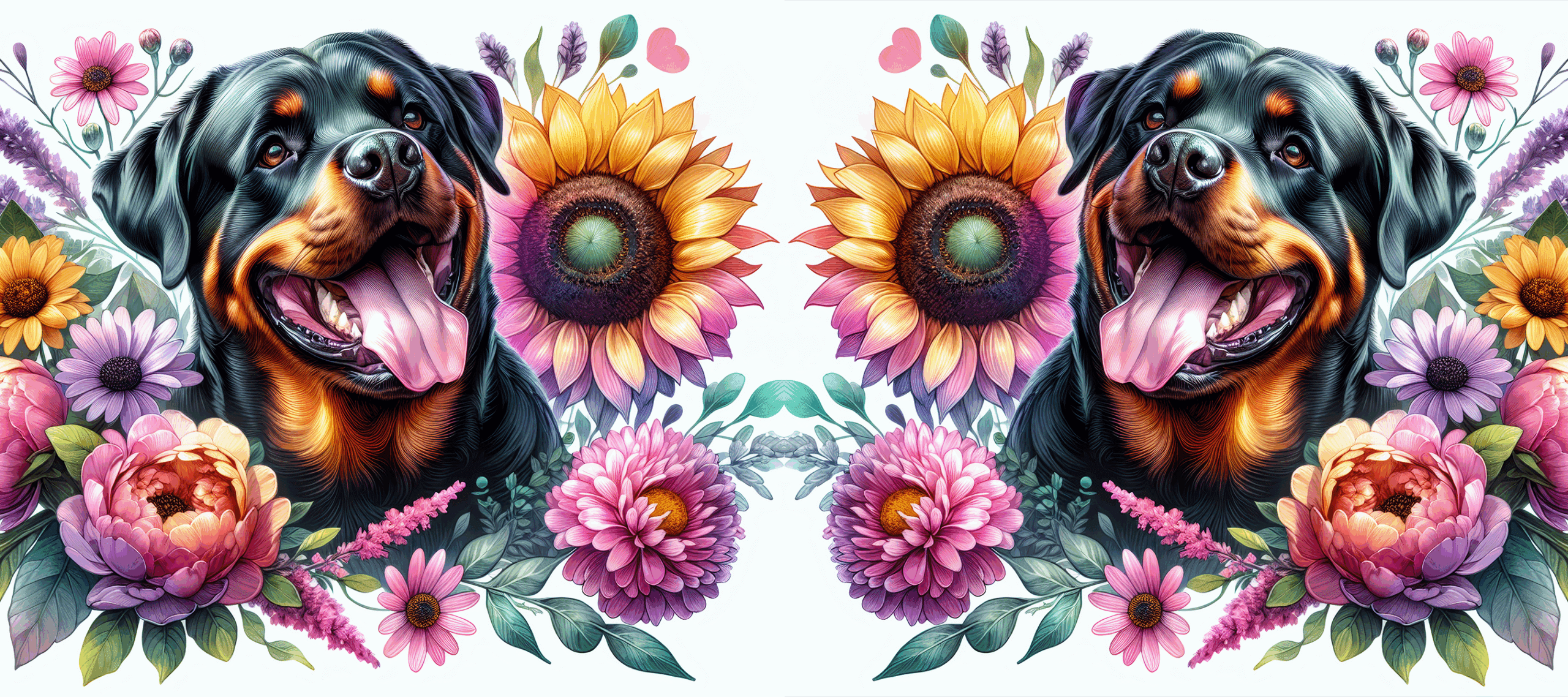 Consequently, the contrast between the dog’s solid stature and the delicate petals creates a visually striking yet emotionally balanced design. Moreover, it celebrates the loyalty, strength, and warmth that make Rottweilers such admired companions.